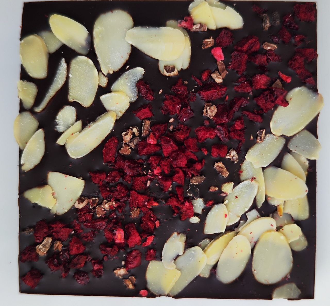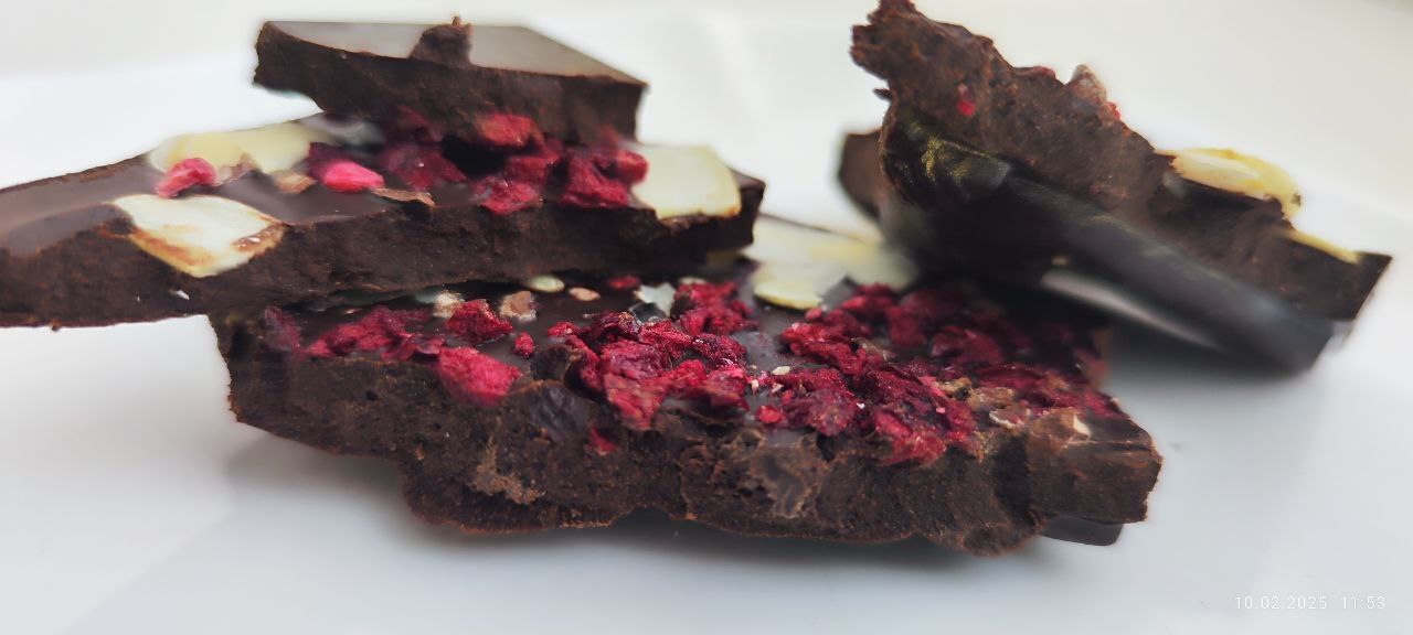 Состав: Какао-масло натуральное Callebaut(Бельгия), какао тертое Tulip, какао-порошок Tulip, мёд разнотравье, вишня сублимированная, миндальные лепестки, кандурин золотой (можно без него)